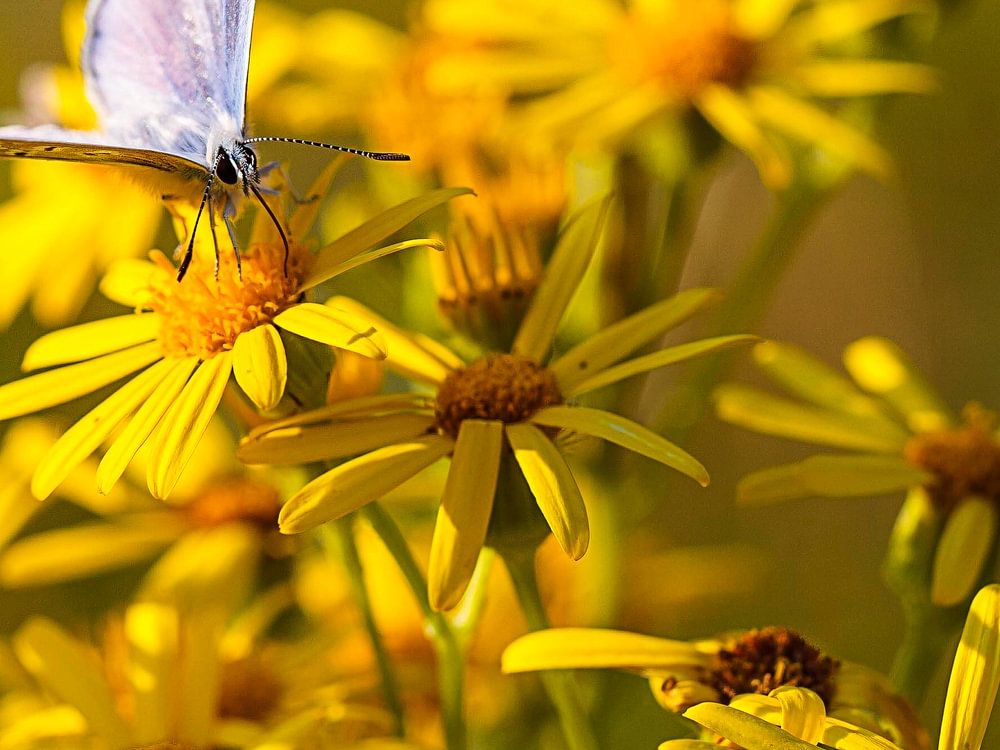 Close-up of the Chalk Hill Blue butterfly on a yellow flower.