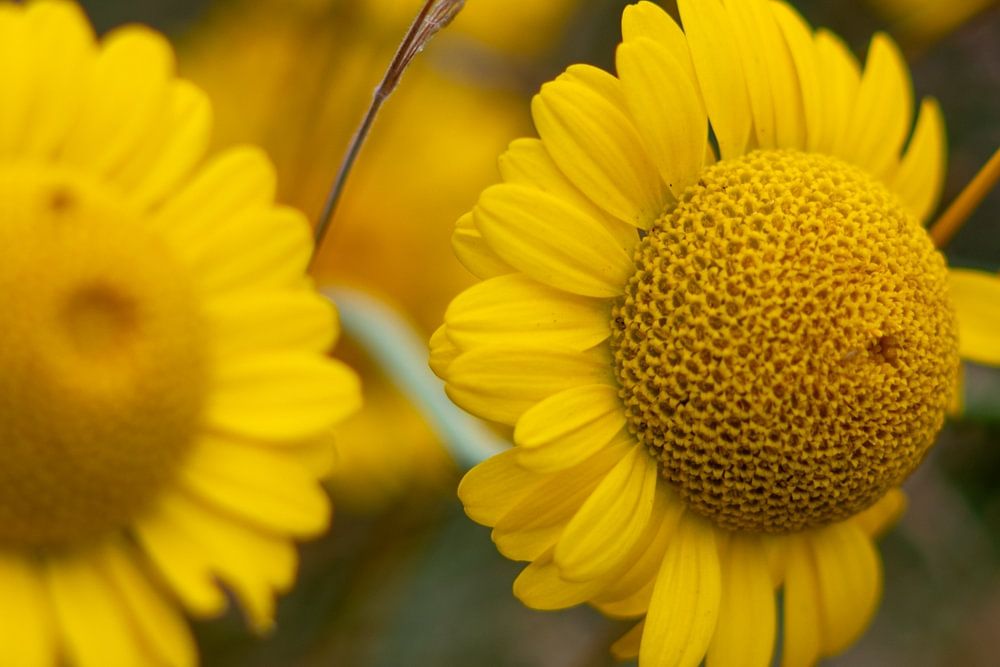 The camomile plant has beautiful large yellow round flowers, which are often found in bunches.