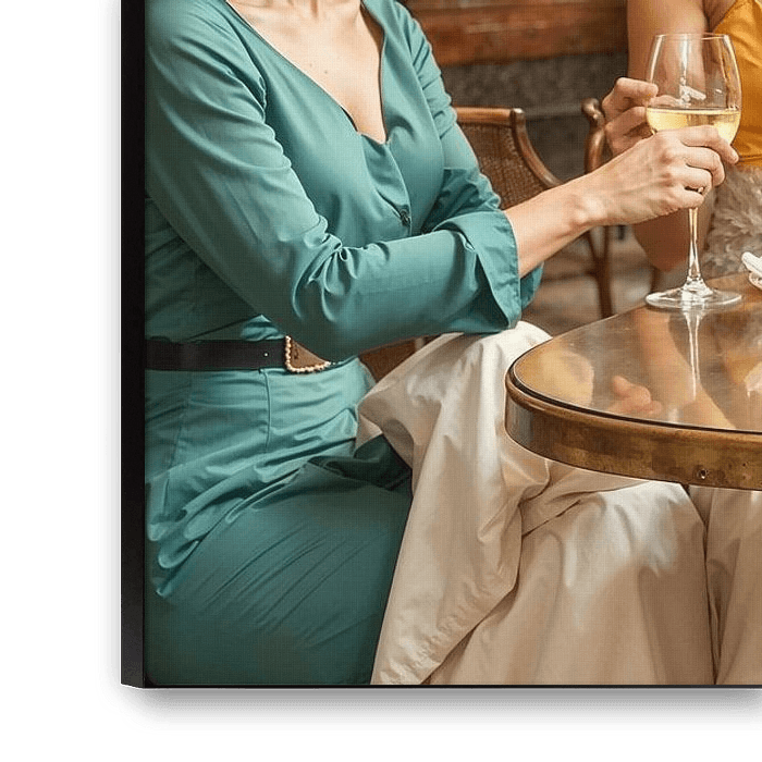 Champagne and Charm is a sparkling work of art that captures the timeless allure of a stylish society moment. The scene is set on a sunny terrace in a historic city, where elegantly dressed ladies in satin dresses and large, flower-adorned hats gather for a celebratory toast. The atmosphere exudes sophistication, gaiety and a touch of nostalgia - an ode to the glamour of days gone by.