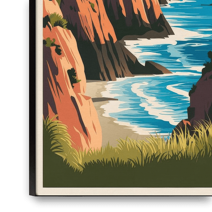 Vibrant cliffs caress the gentle waves of the ocean as the sun casts golden rays across the landscape. With rich colours and a touch of adventure, this artwork is a testament to the beauty of the Channel Islands. Ideal for the living room, it brings fresh energy and inspires dreams of travelling and experiencing nature.