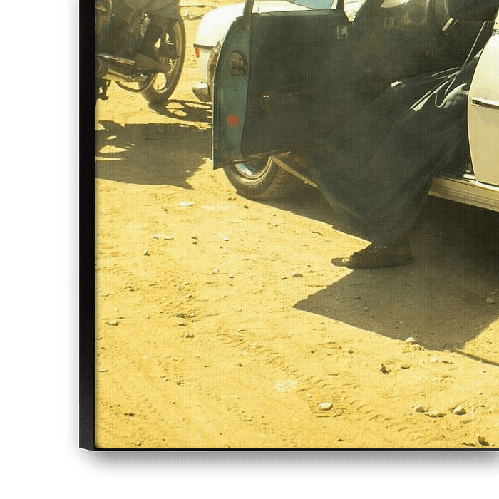 On the bustling streets of Cairo, where traffic seems to be a chaotic dance amidst busy and hectic life, a car comes to an abrupt halt for an unexpected scooter crossing its path. A man, dressed in a white djellaba, gets out of his car, his face hidden from view.