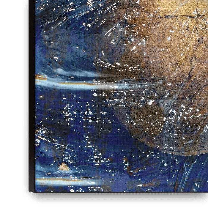 Abstract mixed media, acrylic paint on canvas in blue, purple and gold shades, with cracked egg shapes.