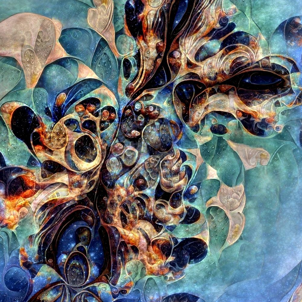 A high resolution blend, of two neural style transfer interpretations, of the same fractal creation . . .