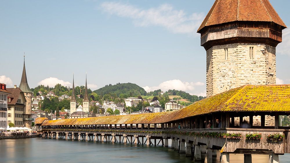 Panoramic image of the beautiful Swiss city of Lucerne, with the famous Chapel Bridge with the Wassertürm, over the river Reuss.