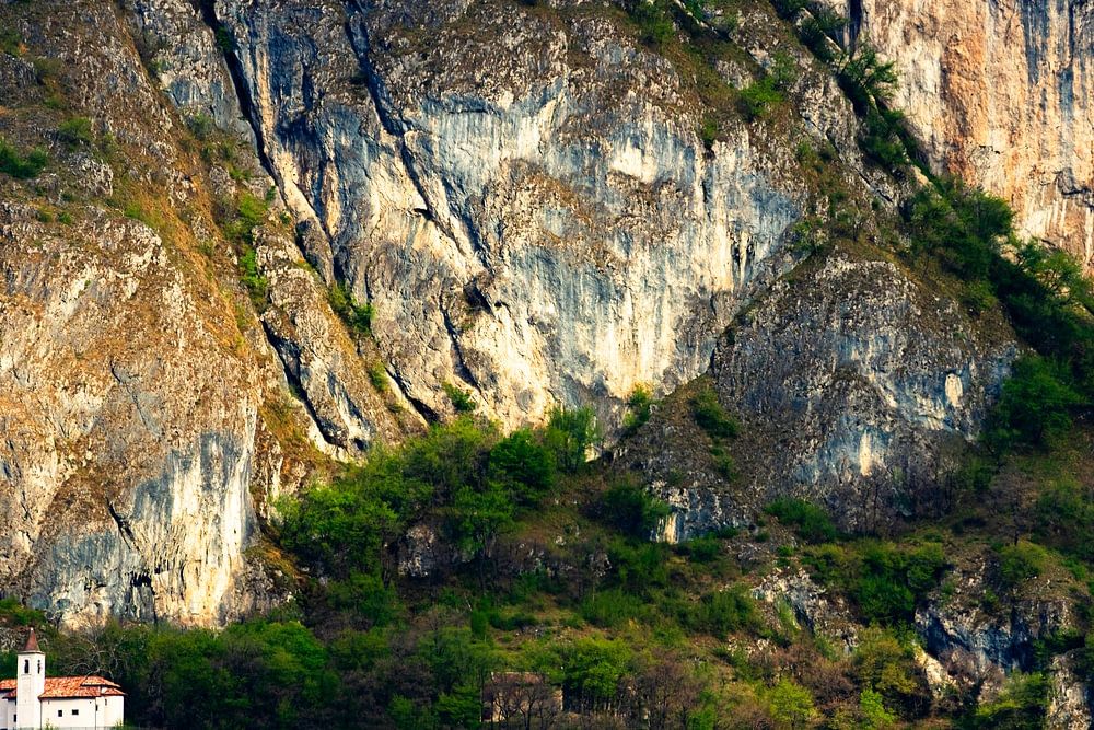 Capella Alpini in the rocks above Tremezzo on Lake Como in Lombardy, Italy. The rock chapel sits on a rocky outcrop with a marvellous view of Bellagio and Lake Como.