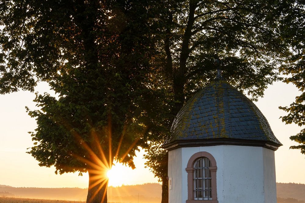 Sunrise over the small chapel near Kapelle bei Lommersdorf in the Ahreifel near Blankenheim Rhineland-Palatinate, Germany