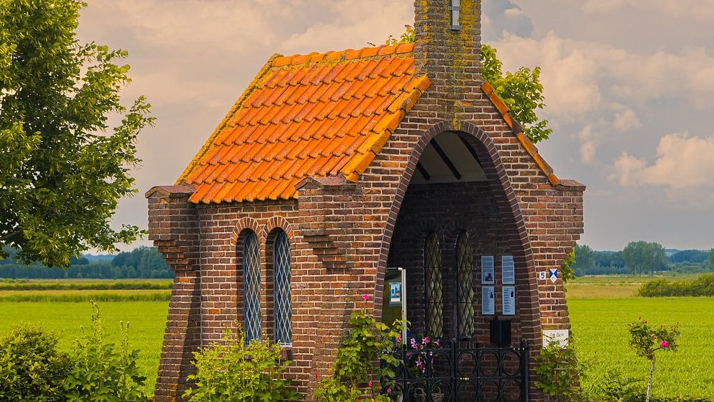 A 16:9 photo of the monument "Onze Lieve Vrouw van de Bloeiende Betuwe'" in Bemmel (Lingewaard municipality), a chapel of the Virgin Mary built of brick. In the chapel, a white natural stone statue of Mary stands on a stone plinth. A white cross is attached to the façade.