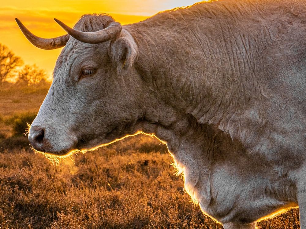 A white Charolais cow on the Hoorneboeg Heath in Hilversum, with the setting sun behind it.