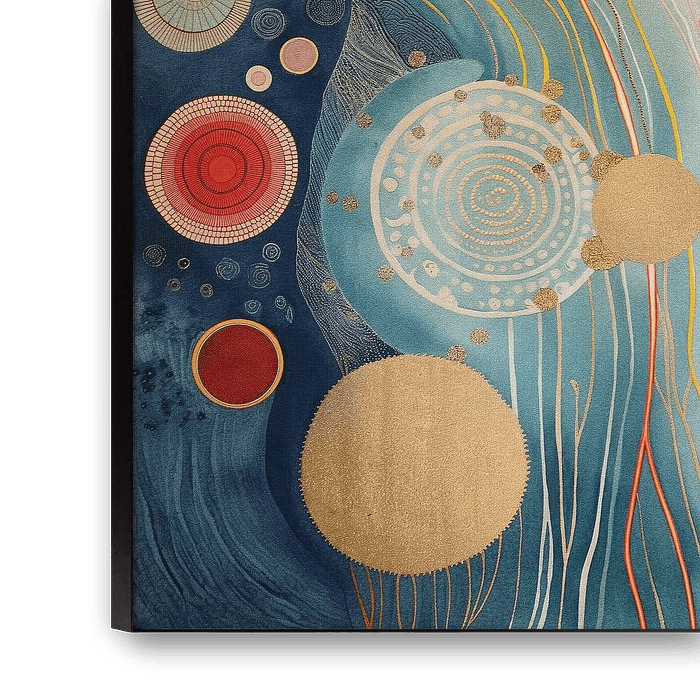 "Charybdis' Whirl" takes us to the depths of Greek mythology, where Charybdis, the sea whirlpool, awaits unsuspecting sailors. This work captures her whirlpool not as a destructive force, but as an enchanting, hypnotic dance of colours and shapes. The spinning patterns and concentric circles in a range of colours, from deep sea blue to sunlit coral red, depict the endless movement and energy of the ocean. The organic shapes and lines flowing through the canvas embody the eternal cycle of ebb and flow, making this work a lush visual symphony of the forces of nature.