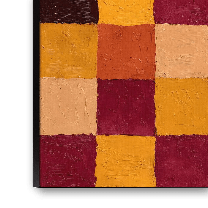 An abstract painting with warm tones in a checkerboard pattern. Modern, playful and full of character - ideal as a statement piece.