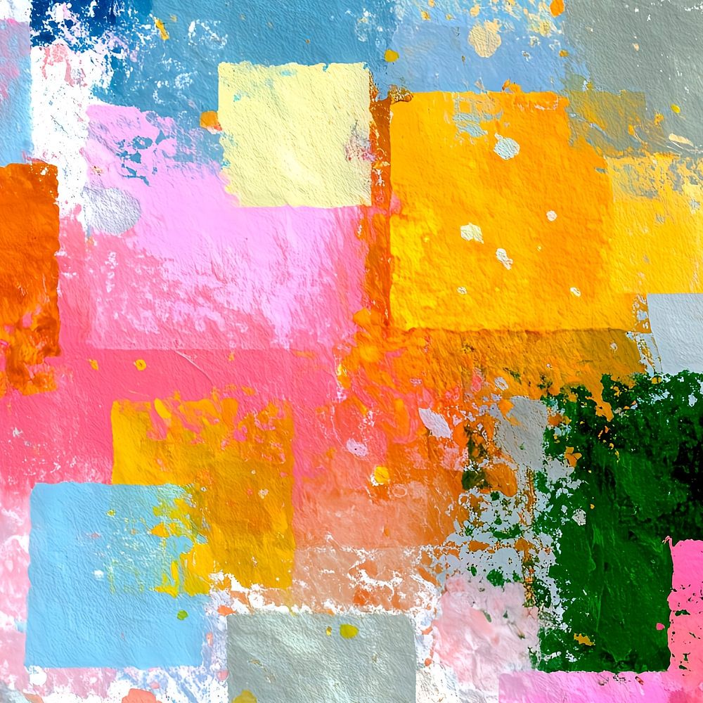 An abstract artwork featuring a vibrant collage of colourful squares in different shades. The squares are spread over a white background, with paint splashes and softer edges in places, creating a dynamic, cheerful composition.