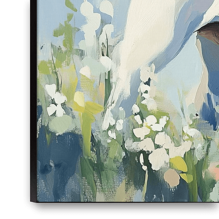 Cheerful Dogs Painting with Flowers - This dog painting depicts a sturdy French bulldog standing confidently in a cheerful flower meadow, with a soft blue sky in the background.