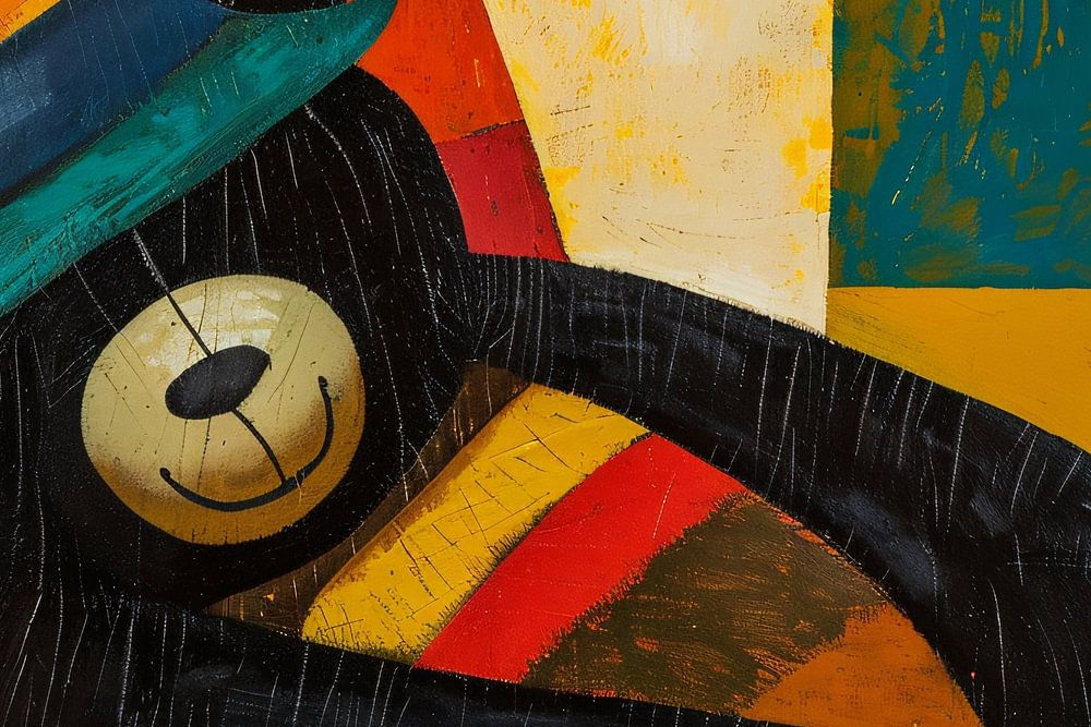 This vibrant and playful design shows a happy bear, relaxing in a colourful environment. The combination of bright colours and cubist style makes this artwork instantly stand out. Perfect for a modern space, this image brings a sense of joy and playfulness. Whether you want to brighten up a children's room, living room or office, this bear with his charming hat is the perfect choice to put a smile on your face. The warm colours and playful nature of the artwork make it a unique addition to any room.