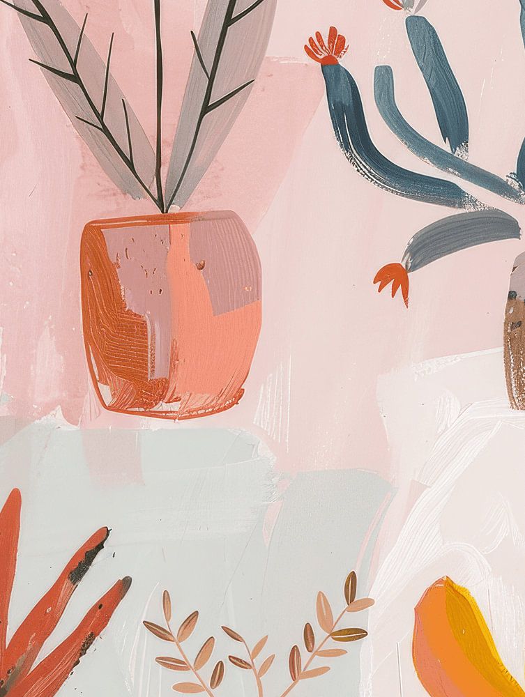 Cheerful botanical still life, illustration. Terracotta, bohemian style. Choose your own size and material for this modern work and make it a real eye-catcher for your interior. Totally contemporary!