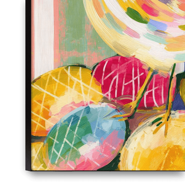 A lively hen stands proudly atop a pile of brightly coloured eggs, immediately capturing everyone’s attention. Her feathers look almost as if they’ve been painted with loose, playful brushstrokes in soft, vibrant shades. The colours blend into one another, giving the whole design a fresh and energetic feel. The hen gazes calmly ahead,…