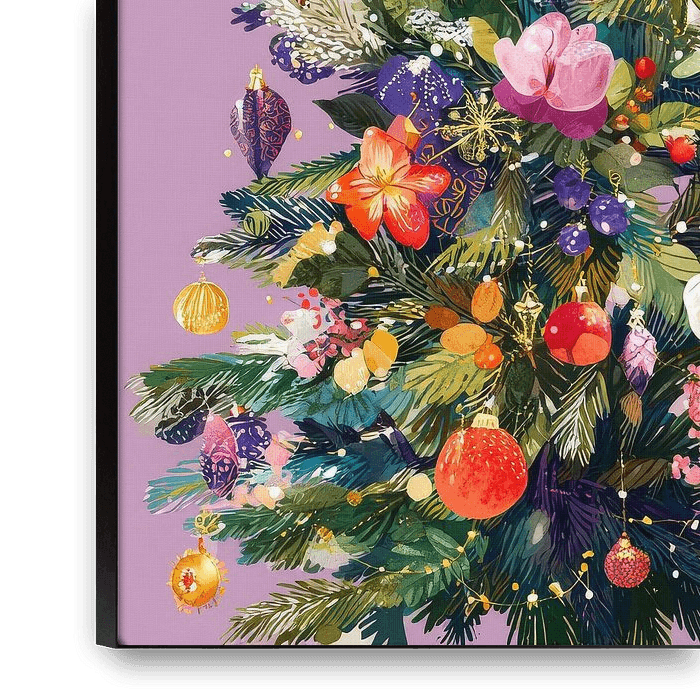 This artwork features an exuberantly decorated Christmas tree that immediately evokes a festive atmosphere. The tree is richly filled with shiny balls, cheerful lights and ornate ornaments. Between the branches, large and small flowers bloom in bright colours that give it a playful twist. The mix of green with pink, red and purple…