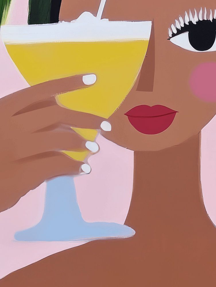 Cheers Baby! Colourful and hip illustration. A young woman raises her glass to summer: cheers! A special eye-catcher for your interior, completely in line with today's trend.