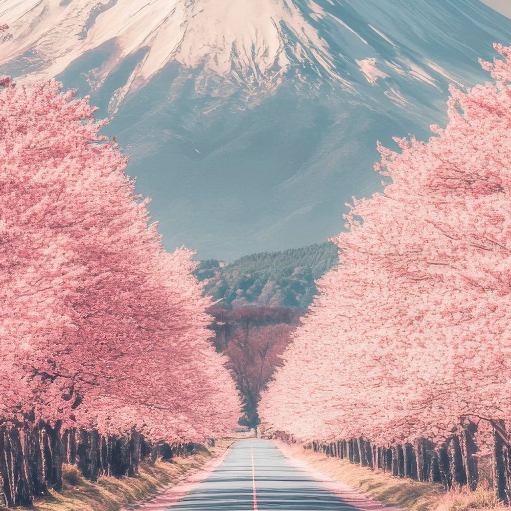 A majestic road, lined with bright cherry blossoms, leads gently into the distance. The majestic mountain towers in the background, covered in glistening snow, while the sky shines in soft pastel colours. The peaceful atmosphere and the harmonious blaze of colour invite you to dream and linger.