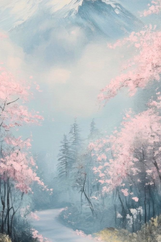 A gentle path winds its way through a dream of blossoming cherry trees, their delicate blossoms covering the path with pink pollen. Majestic mountains tower in the background, shrouded in a mystical mist, while the light of dusk bathes the scene in soft pastel colours and creates a peaceful, almost fairytale-like atmosphere.