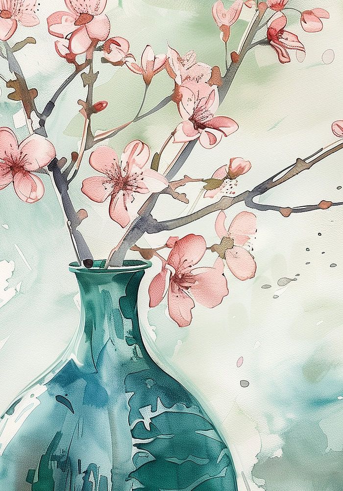 Watercolour of pink cherry blossoms in a water blue vase. Wet painted with water technique and splashes. Various shades of rose. Impressionistic painting. Fitting with various styles and trends, including pastels, flowers and cherry blossoms. Artist: Bianca ter Riet