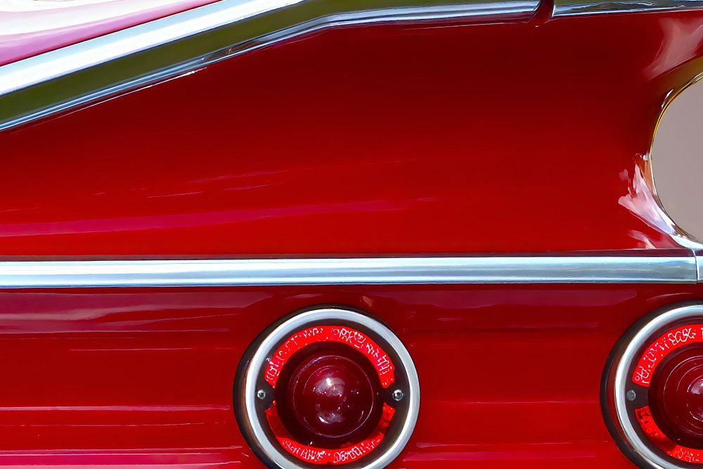 The characteristic circular tail lights with their textured red lenses have become icons of American automotive design. This harmonious composition of powerful red and elegant chrome creates a timeless aesthetic that enhances any room.
