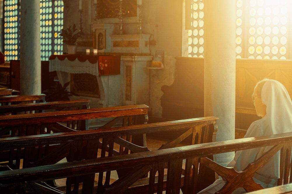 The Chiesa di Santa Maria della Rosa stands on the edge of the city centre. The church in Tuscan Lucca seems deserted, but in the last remnant of sunlight shining inside, a nun is praying.