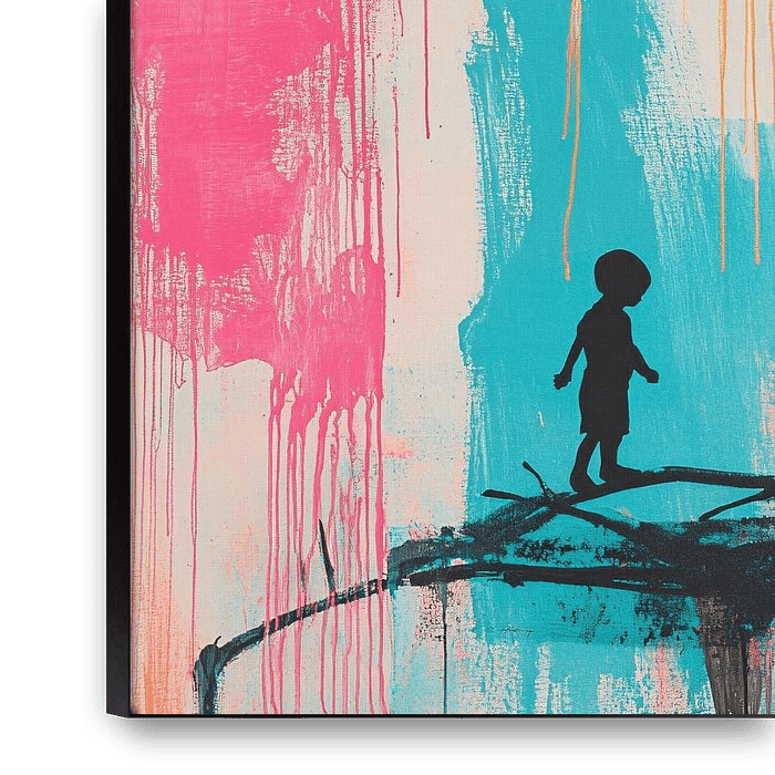 This abstract artwork brings to life a dynamic interplay of colours and shapes. With a silhouette of a child balancing over a branch, against a background of vibrant shades of pink, orange and blue, the design exudes playfulness and energy. The black silhouettes contrast beautifully with the colourful background, creating a unique…
