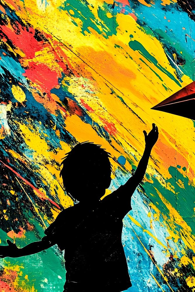 A powerful and colourful artwork centring on the silhouette of a child holding a paper aeroplane. The design combines abstract colours with a sense of movement and energy, making it perfect for contemporary interiors. The playful colours and dynamic composition bring life to any space, while the silhouette evokes a sense of innocence and fantasy. This piece fits perfectly in a modern setting, such as a bedroom or hobby room, and can also inspire creative spaces.