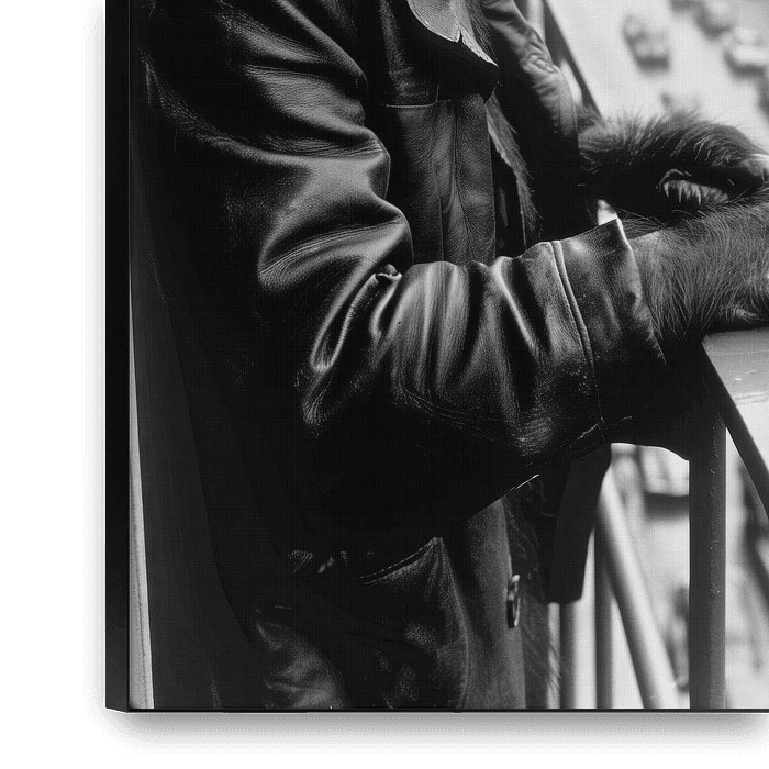 The picture shows an intriguing scene of a cigarette-smoking chimpanzee, dressed in a tough leather jacket and classic hat, standing casually on a balcony. The expression on his face exudes a mix of quirky determination and curious observation. Below him stretches a lively street, infused with the energy of New York City. While cars…