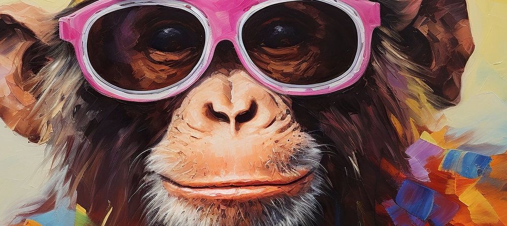 Chimpanzee - This playful painting shows a chimpanzee wearing pink sunglasses and a colourful outfit. The style is contemporary with a pop art influence, using vibrant, high-contrast colours and expressive brushstrokes. The painting exudes a sense of humour and vibrancy, which would make it a unique addition to a modern interior.
