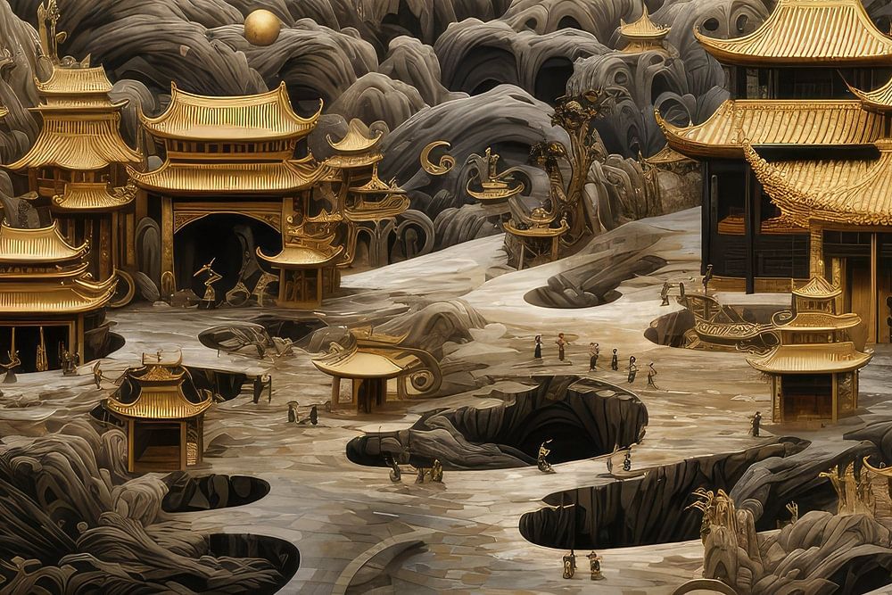 Discover an enchanting world full of surreal beauty with this digital painting. The playful interplay of gold, black and white brings a mystical atmosphere to life, while the graceful Asian houses spark your imagination. Every brushstroke and line tells a story of enchantment and wonder. Be transported to a timeless reality where the boundaries of imagination are blurred. This unique work of art is not only a feast for the eyes, but also a conversation piece that enchants your guests. Bring this surreal splendour into your home and immerse yourself in a world of unlimited creativity.
