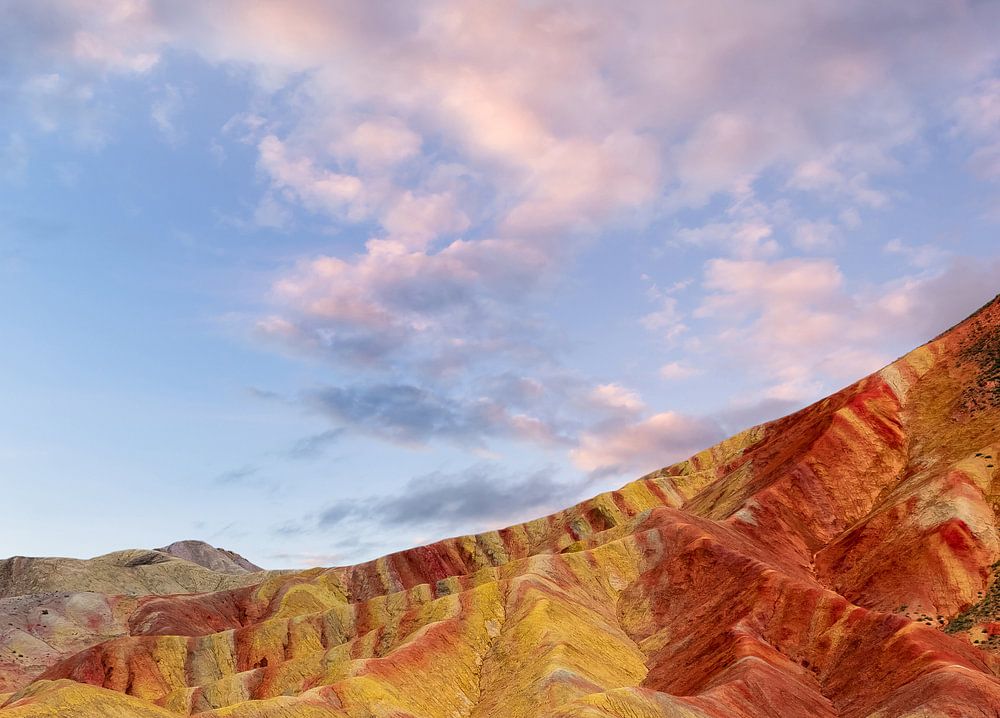Rainbow Mountains between the Gobi Desert and the Himalayas. Landscape of China with orange and blue. Beautiful nature. Photo just before sunset with beautiful colors and pink clouds.