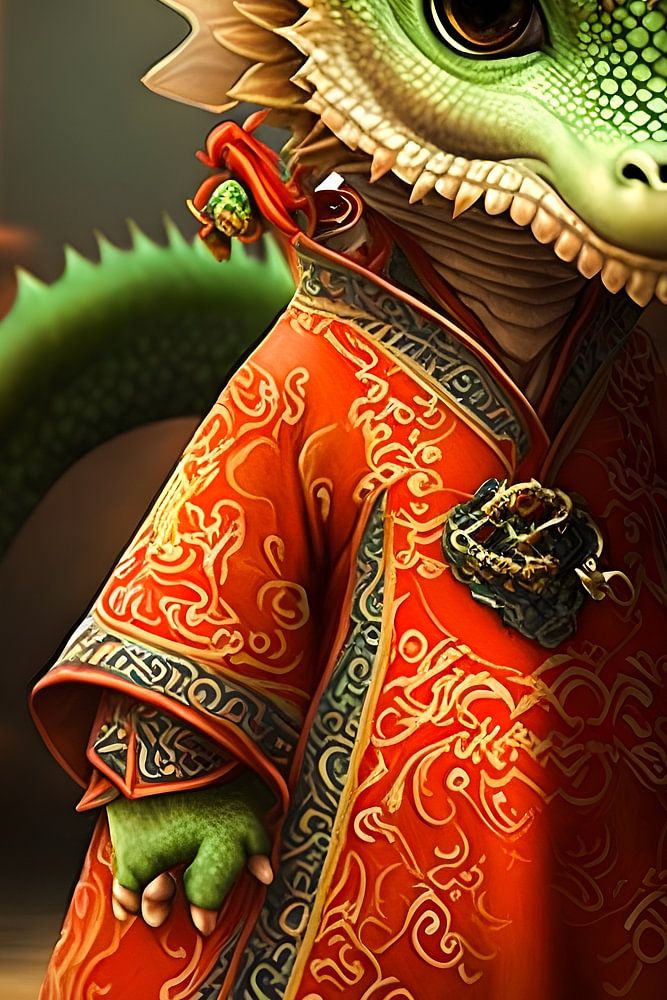 A cute green dragon in a traditional red Chinese outfit. In the background you can see a traditional Chinese flat. The scene radiates a warm and inviting atmosphere and conveys the feeling of being part of Chinese culture. The picture conjures up a smile on the faces of the viewers and transports them into the magical world of Chinese culture.