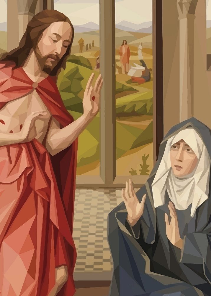"Christ Appearing to His Mother" (style Lowpoly) inspiration from a painting by Juan de Flandes in (ca 1496)