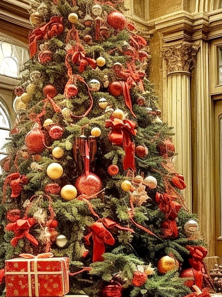 This picture shows an opulently decorated Christmas tree standing in the centre of a sumptuous room with gold-coloured wood panelling and large, arched windows. The tree is richly decorated with red ribbons, gold and red baubles and other festive ornaments. The top is adorned with a large, star-shaped tree decoration. Lovingly wrapped presents in shades of red and gold are stacked around the base of the tree, some of which are decorated with bows. The warm, festive lighting and detailed architectural elements create a luxurious and inviting atmosphere that captures the magic and splendour of the Christmas season.
