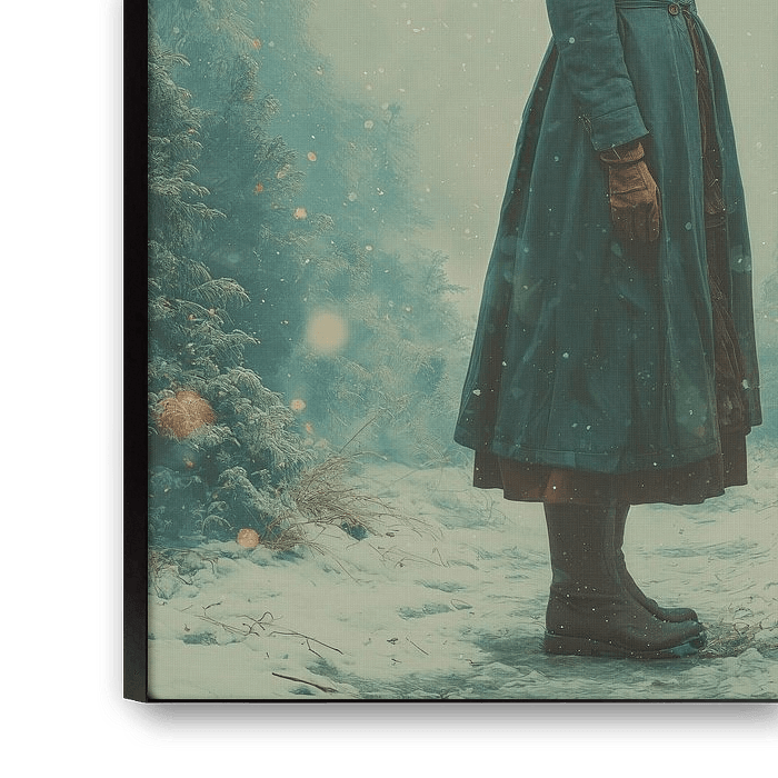 A young woman stands alone in a snowy forest landscape, dressed in a classic dark green coat, holding an umbrella. Above her head floats a cloud of pastel-colored Christmas baubles—pink, peach, mint green, and gray—that seem to represent her thoughts or dreams. The contrast of the warm balloon colors against the cold, misty winter tones creates a poetic visual moment that exudes introspection, hope, and the contrast between inner life and outer stillness.
