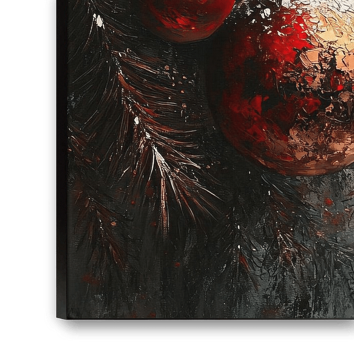 Christmas | Shiny Christmas Decorations - This Christmas painting shows richly decorated red baubles glittering on green pine branches against a misty, wintery background.