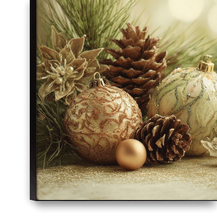 This atmospheric art image captures the essence of classic Christmas decoration with an elegant composition of golden-green baubles, pine cones and sparkling floral accents. The subtle shimmer on the ornaments and the warm background with soft bokeh lights create a luxurious, festive look. The combination of natural elements such as…