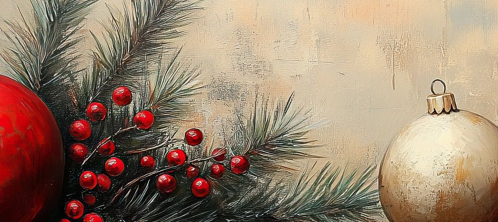 Details: Christmas, painting, baubles, pine branches, red berries, holidays, winter, decoration, Christmas spirit, traditional