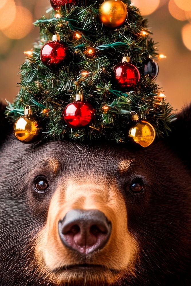 A cheerful bear with a festive Christmas tree on its head radiates cosiness and the magic of the holidays. Surrounded by twinkling lights, this charming picture brings a playful touch and warmth to any living room. Ideal for creating a festive atmosphere that invites you to smile and linger.
