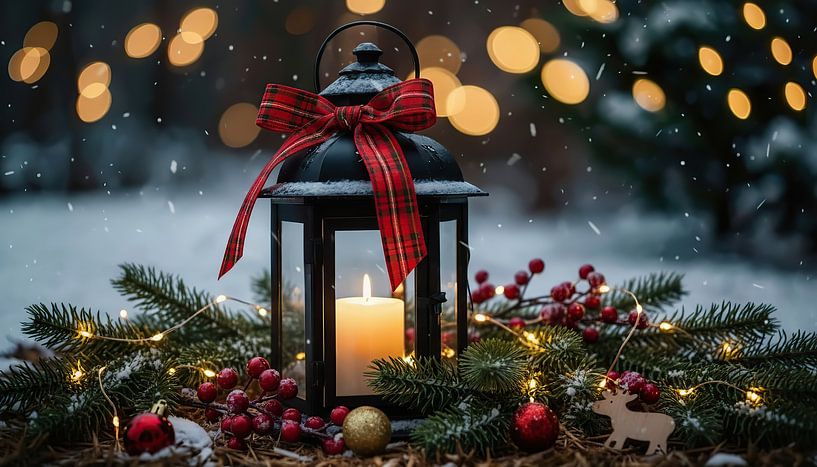 Lantern with Christmas decorations in the snow