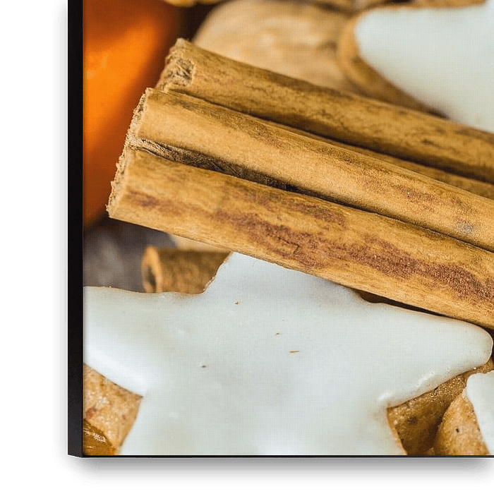Buy the photo Christmas food, sweet star shape biscuits, chocolates, nuts, oranges and cinnamon by Alex Winter on canvas, ArtFrame, poster and wallpaper, printed on demand in high quality.