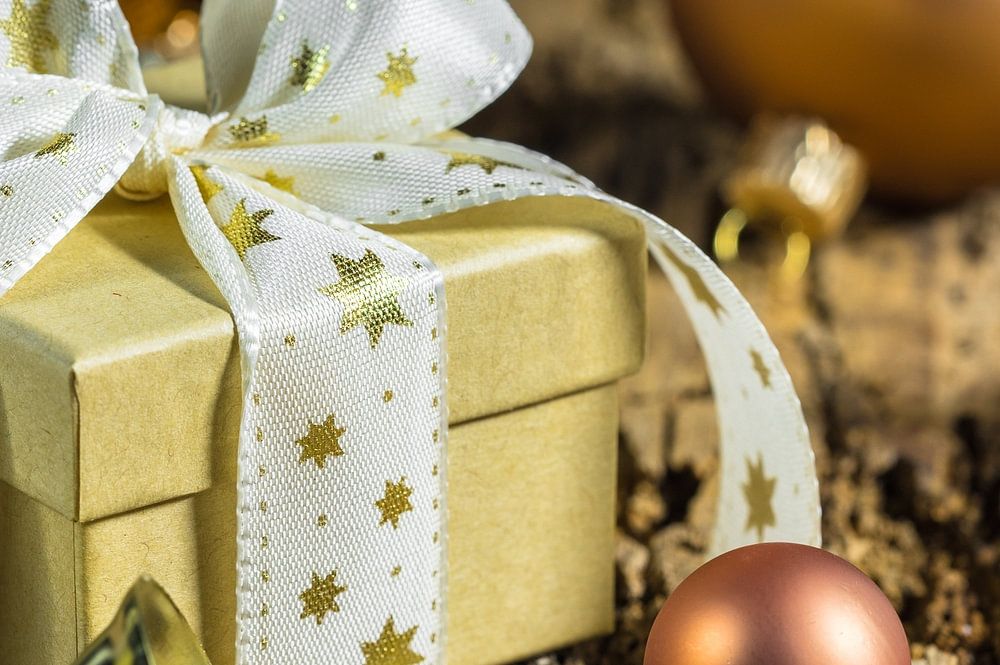 Christmas gift box with ribbon bow, golden baubles by Alex Winter