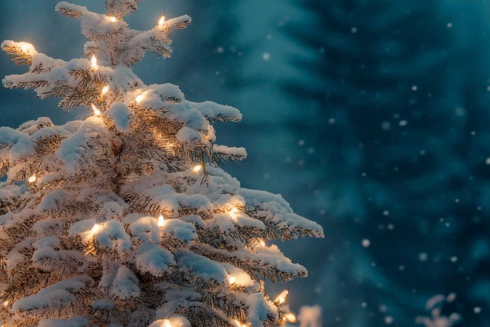 A sparkling Christmas tree, gently enveloped by a snow-covered winter landscape, radiates a warm light in the twilight. The snow-covered spruce trees in the background lend the picture a magical atmosphere. Perfect for the living room, it invites you to dream and enjoy the festive mood.