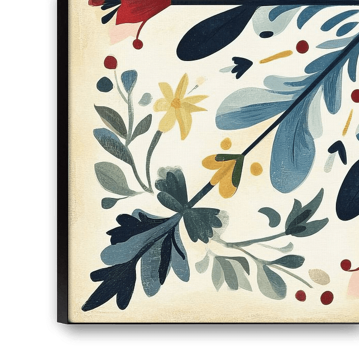 Christmas Pattern | Red Flower with Green Leaves - This Christmas painting shows a symmetrical pattern with plants and flowers, centred around a red flower, supported by blue and green leaf shapes and small red and yellow details.