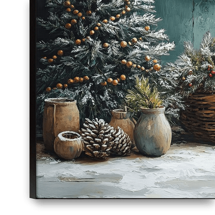 Christmas Still Life | Traditional Christmas Still Life in Blue - This Christmas still life painting shows a festively decorated room with a snow-covered Christmas tree, a matching wreath and a wicker basket full of pine branches, accompanied by some rustic, earthenware pots and a large pine cone on a wooden floor against an old…