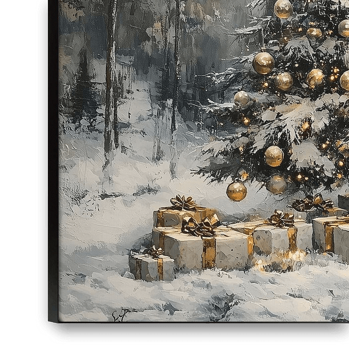 Christmas Tree | Christmas Tree in Snow - This is a Christmas tree painting of a large snow-covered Christmas tree in a quiet winter forest, a realist-impressionist painting with warm golden baubles, lights and gold-wrapped presents in the snow, and this painting Christmas tree mainly captures the Christmas tree and the shiny…