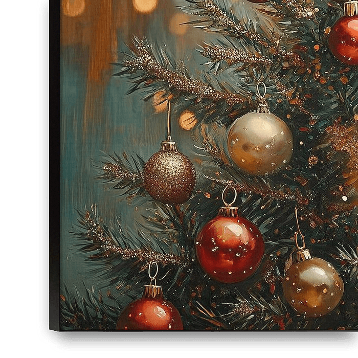 Christmas Tree with Gold Star - In this Christmas tree painting, you will see a modern Christmas tree painting with a shimmering gold star at the top and shiny red and gold baubles in lush green branches against a soft teal-like bokeh background, a painting Christmas tree that instantly radiates Christmas atmosphere and…