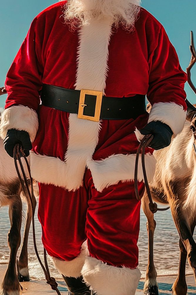 Imagine an unforgettable Christmas atmosphere that combines the warmth of the festive season with a touch of summer. A jolly Father Christmas, surrounded by majestic reindeer, strolls along the beach as the waves gently lapping the shore. This vibrant image adds a touch of magic to any living room and invites cheerful conversation.