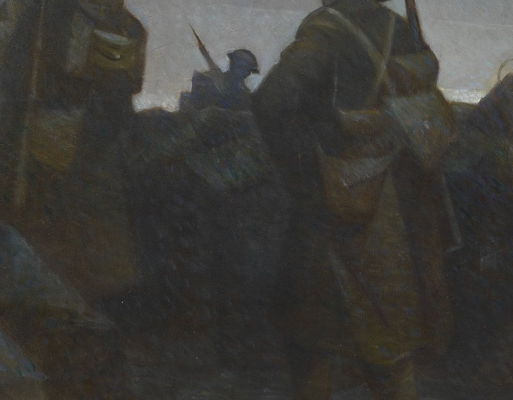 British soldiers walking through a trench at dawn. They are wearing full equipment and walking with their backs to the viewer. The heaviness of the scene is reflected in the gray landscape and sky behind it.